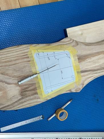 印刷した図面を貼り付けて、天板にFホールの加工開始。(2025.05.17