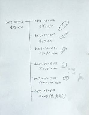 ツリーには、そのアセンブリやパーツの名前まで仮決めして書いておきます。名前の付け方で迷うのは時間の無駄なので、通し番号を使っておくのが効率的だと思います。それをそのまま3Dのモデル名としても可です。(「最初から正式な部品番号をモデル名にしておくべきかどうか?」については諸説あります。)
