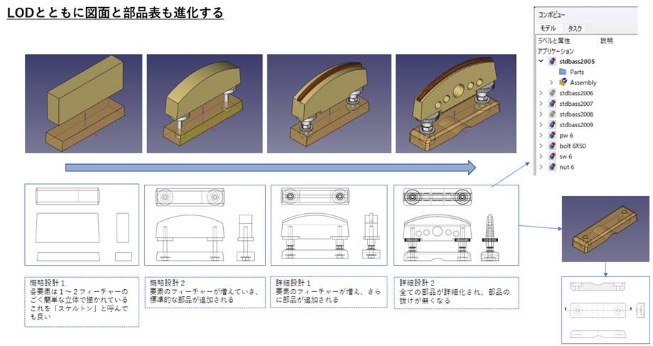 E この時点でほぼ同時にすべてのパーツやアセンブリの「図面」も作って保存しておきます。少しずつ出来上がってくるそれぞれの立体の「寸法」や「隙間」の確認には図面のほうが便利なことも多いからです。もちろんこの図面もLOD(Level Of Detail下図参照)が上がるとともに同時に成長し、3Dモデルが出来上がったときには図面も(寸法や公差の追記は当然必要なので、少なくとも線画としては)完成していることになります。